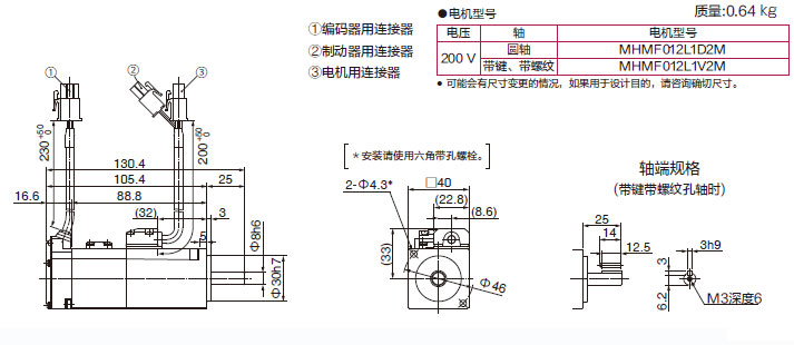 產品信息適用驅動器產品圖紙相關產品資料下載截至2023年02月17日 為了改善本產品,會有在未事先通知的情況下變更本產品的規格及設計的情況。規格詳細項目內容訂貨產品號MHMF012L1V2M詳細高慣性 (高慣量), 導線型家族名MINAS A6系列MHMF 系列類型高慣性 (高慣量)特殊訂購產品特殊訂購產品提示 : 特殊訂購產品請避免將電機或裝有電機的設備出口到日本,或通過日本出口到其它地區。保護等級IP65提示 : 保護構造輸出軸旋轉部、導線部前端除外。環境條件詳情請通過使用說明書等進行確認。法蘭角40 mm法蘭角 (單位 : mm)40電機引出部構造導線電機 ? 編碼器連接器導線電源設備容量 (kVA)0.5電壓規格 (V)200額定輸出 (W)100額定電流 (A (rms))1.1保持制動器有重量 (kg)0.64油封有軸規格帶鍵帶螺紋額定轉矩 (N ? m)0.32堵轉轉矩 (N ? m)0.33瞬時最大轉矩 (N ? m)1.11瞬時最大電流 (A (o-p))5.5再生制動器頻率(次 / 分)無選購部件 : 無限制有選購部件: 無限制選購部件 (外置再生電阻) 型號 : DV0P4281再生制動器頻率關于[電機規格補充] 注1), 注2)相關請參照。額定轉速 (r/min)3000最高轉速 (r/min)6500轉子慣量 ( x10-4?kg ? m2)0.074對應轉子慣量的推薦負載慣量比30 倍以下對應轉子慣量的推薦負載慣量比關于[電機規格補充] 注3)相關請參照。旋轉編碼器 : 規格23 bit 絕對式/增量式系統提示作為增量式系統使用時(不使用多圈數據),請不要連接絕對式編碼器用電池。旋轉編碼器 : 分辨率8388608制動器規格項目內容靜摩擦轉矩 (N ? m)0.38 以上吸引時間 (ms)35 以下釋放時間 (ms)20 以下勵磁電流 DC (A)0.3釋放電壓 DC (V)1 以上勵磁電壓 DC (V)24 ± 2.4制動器規格關于[電機規格補充] 注4), "電機內置保持制動器規格" 相關請參照。容許載重項目內容組裝時 : 徑向載重 P 方向 (N)147組裝時 : 軸向載重 A 方向 (N)88組裝時 : 軸向載重 B 方向 (N)117.6運轉時 : 徑向載重 P方向 (N)68.6運轉時 : 軸向載重 A,B 方向 (N)58.8容許載重關于詳情請參照 [電機規格補充] "輸出軸的容許載重"截至2023年02月17日 為了改善本產品,會有在未事先通知的情況下變更本產品的規格及設計的情況。適用驅動器訂貨產品號系列類型I/F 功能區分外形型號名電源電壓規格MADLN05NEA6NE系列RTEX (通用型)RTEXA 型單相/三相 200 VMADLN05SEA6SF系列位置控制型脈沖列專用A 型單相/三相 200 VMADLN05SGA6SG系列通用通信型脈沖, Modbus (RS485/RS232)A 型單相/三相 200 VMADLT05NFA6NF系列RTEX (多功能型)RTEXA 型單相/三相 200 VMADLT05SFA6SF系列多功能型模擬/脈沖, Modbus (RS485/RS232)A 型單相/三相 200 VMADLN05BEA6BE系列EtherCAT(通用型)EtherCATA 型單相/三相 200 VMADLT05BFA6BF系列EtherCAT(多功能型)EtherCATA 型單相/三相 200 V截至2023年02月17日 為了改善本產品,會有在未事先通知的情況下變更本產品的規格及設計的情況。[単位mm]外形尺寸圖 MADLT05SF|松下伺服驅動器50/100W 多功能型 支持模擬量 全閉環 STO 訂貨產品號:MADLT05SF 產品:伺服驅動器 詳細:A6SF系列,50/100瓦驅動器,多功能型(脈沖、模擬、全閉環),有安全功能 產品名稱:MINAS A6 家族 伺服驅動... MADLN05SG|松下伺服驅動器50/100瓦 通信型(脈沖+Modbus)位置控制+絕對值用 訂貨產品號:MADLN05SG 產品:伺服驅動器 詳細:A6SG系列,50/100瓦驅動器,A6SG系列,通用通信型,脈沖+Modbus (RS485/RS232),無安全功能(無STO功能) 產... MSMF012L1V2M|松下伺服電機100瓦 小慣量 有剎車 訂貨產品號:MSMF012L1V2M 產品:伺服電機(伺服馬達) 詳細:100瓦,小慣性 (低慣量), 帶剎車,鍵軸,帶油封,導線型 產品名稱:MINAS A6 家族 伺服電機 ... MADLN05SE|松下伺服驅動器50/100瓦 脈沖型(位置控制專用) 訂貨產品號:MADLN05SE 產品:伺服驅動器 詳細:A6SE系列,50/100瓦驅動器,位置控制型 (增量式系統專用, 脈沖列專用),無安全功能(無STO功能) 產品名稱:... MHMF012L1U2M|松下伺服電機100瓦 大慣量 無剎車 訂貨產品號:MHMF012L1U2M 產品:伺服電機(伺服馬達) 詳細:100瓦,高慣性 (高慣量), 不帶剎車,鍵軸,帶油封,導線型 產品名稱:MINAS A6 家族 伺服電機... MHMF012L1V2M|松下伺服電機100瓦 大慣量 有剎車 訂貨產品號:MHMF012L1V2M 產品:伺服電機(伺服馬達) 詳細:100瓦,高慣性 (高慣量), 帶剎車,鍵軸,導線型 產品名稱:MINAS A6 家族 伺服電機 特長:50 ... MADLN05BE|松下伺服驅動器50/100瓦 EtherCAT總線 訂貨產品號:MADLN05BE 產品:伺服驅動器 詳細:A6BE系列,50/100瓦驅動器,EtherCAT總線控制型,無安全功能 產品名稱:MINAS A6 家族 伺服驅動器 特長:50 ... MSMF012L1U2M|松下伺服電機100瓦 小慣量 無剎車 訂貨產品號:MSMF012L1U2M 產品:伺服電機(伺服馬達) 詳細:100瓦,小慣性 (低慣量), 不帶剎車,鍵軸,帶油封,導線型 產品名稱:MINAS A6 家族 伺服電機...查看所有 標簽:伺服電機松下松下伺服100w 上一篇: MBDLN25SE|松下伺服驅動器400瓦 脈沖型(位置控制專用) 下一篇: MHMF012L1U2M|松下伺服電機100瓦 大慣量 無剎車