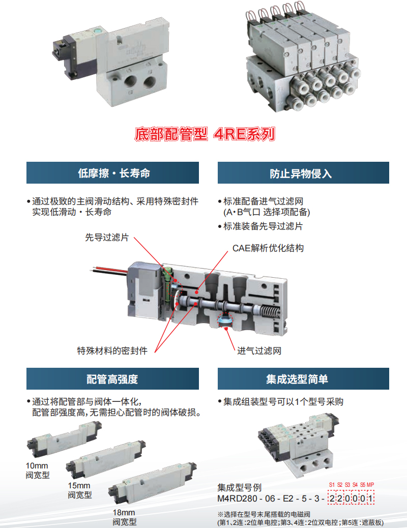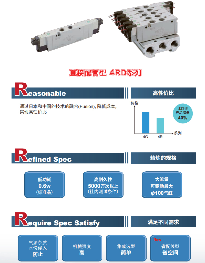 CKD先導式5通換向閥4RD?E Series 2023/02/20 CKD氣動元件 CKD電磁閥 產品中心 2319 0新增省配線規格和DIN端子箱選擇項!繼承4GR的基本性能,結構簡單、性價比高的先導式5通電磁閥上市。低功耗 0.6w (標準品)高耐久性 5000萬次以上 (社內測試條件)大流量 可驅動最大 φ100氣缸氣源雜質 水份侵入 防止機械強度高,集成選型簡單,省配線型省空間微信客服