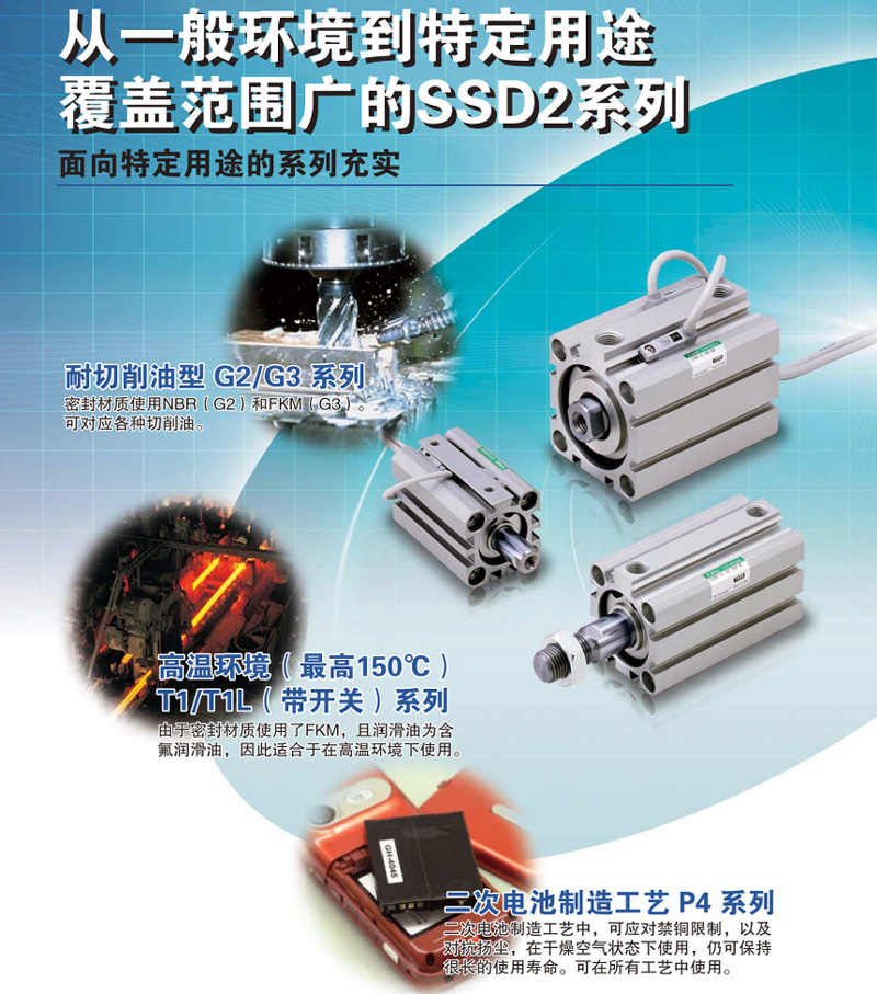 | SSD2-T1 | 雙作用?耐熱型 | Φ12, Φ16, Φ20, Φ25, Φ32, Φ40, Φ50, Φ63, Φ80, Φ100 |