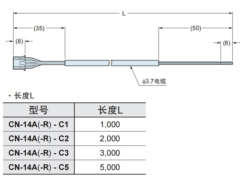 | 附帶連接器電纜 | CN-14A-C1 | 長1m | 附帶0.2mm2?4芯單側連接器的橡膠絕緣電纜 電纜外徑:φ3.7mm |