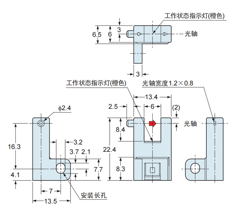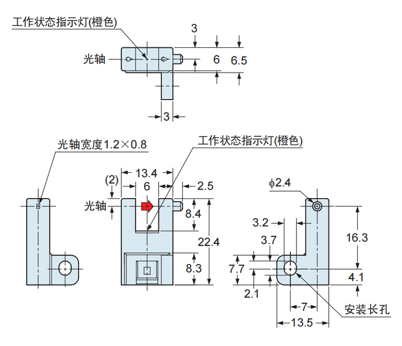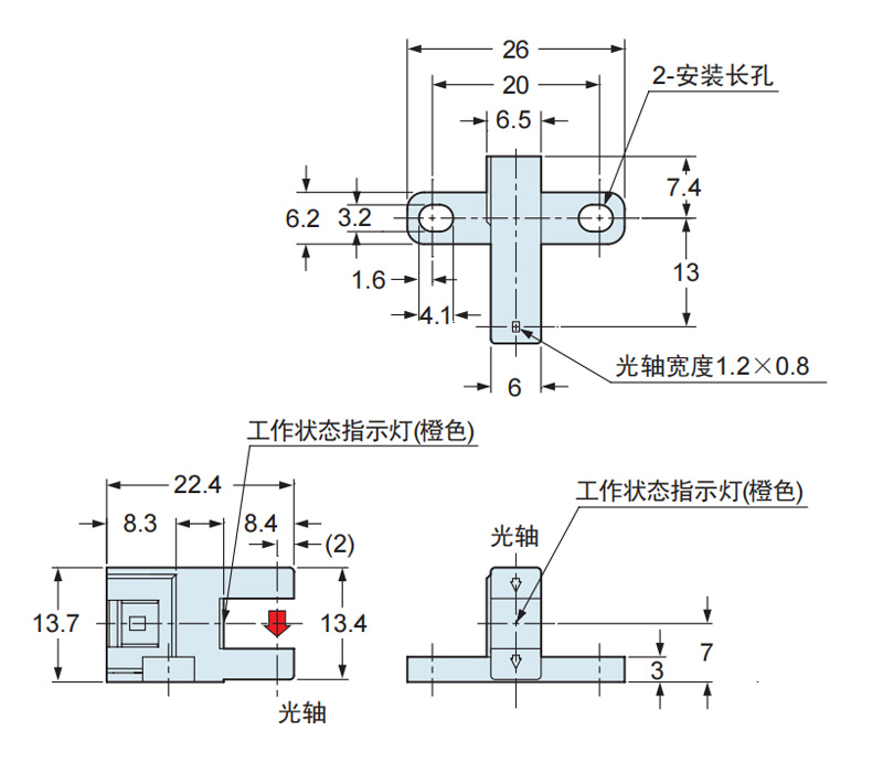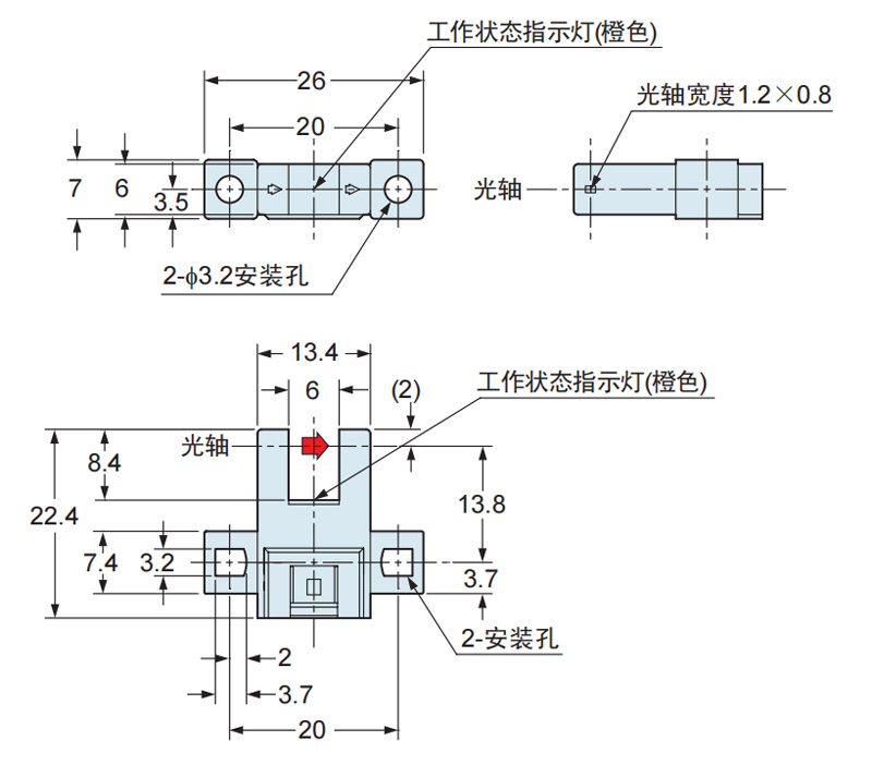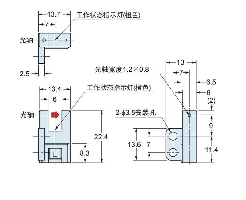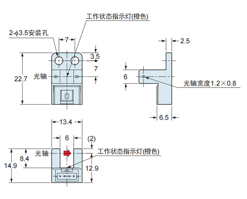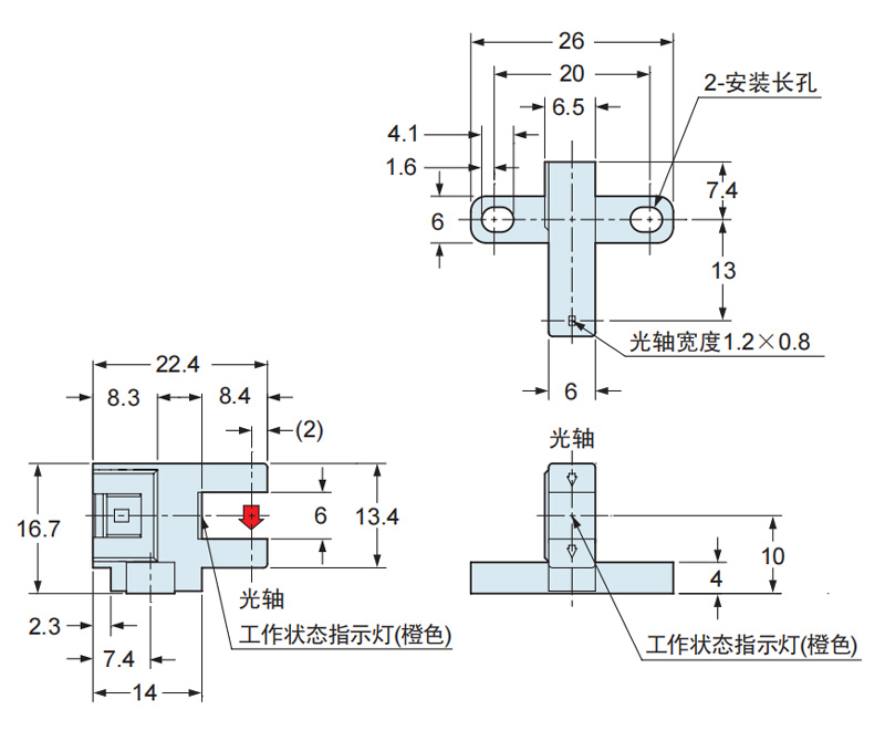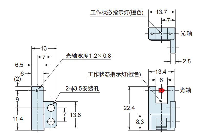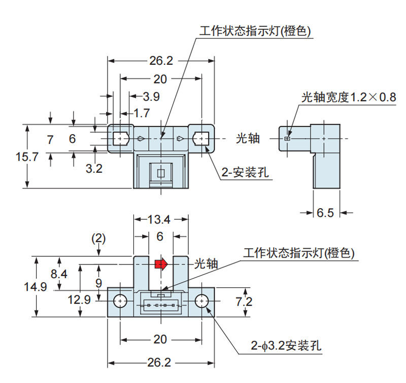 | 工作狀態指示燈 | 橙色LED(入光時亮燈) | ||