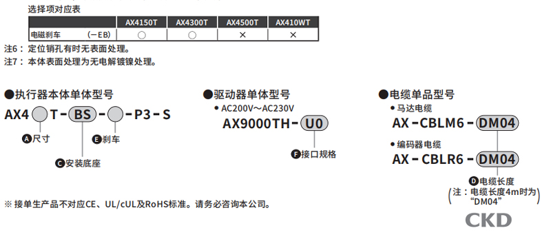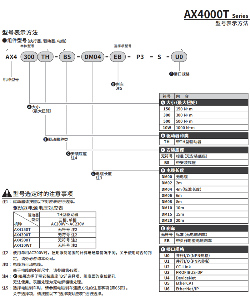 產品信息規格介紹命名規則產品圖紙相關產品資料下載總有一種理由讓它成為選擇。可根據用途和目的選擇直驅馬達種類豐富的產品陣容此系列包含四款規格:AX4150T / AX4300T / AX4500T / AX410WT 總有一種理由讓它成為選擇。可根據用途和目的選擇直驅馬達種類豐富的產品陣容此系列包含四款規格:AX4150T / AX4300T / AX4500T / AX410WT各規格參數如下執行器規格項目AX4150TAX4300TAX4500TAX410WT最大輸出扭矩 N ·m1503005001000連續輸出扭矩 N ·m50100160330最快轉速 rpm100(注1)7030允許軸向負載 N20000允許力矩負載 N ·m300400500400輸出軸慣性力矩 kg ·m20.21200.32600.72102.7200允許負載慣性力矩 kg ·m275.00(注2)180.00(注2)300.00(注2)600.00(注2)分度精度(注4) 秒±30重復精度(注4) 秒±5輸出軸摩擦扭矩 N ·m10.015.020.0分辨率 P/rev540672馬達絕緣等級F類馬達耐電壓AC1500V 1分鐘馬達絕緣電阻10MΩ以上 DC500V使用環境溫度0~45℃(0~40°C:注5)使用環境濕度20~85%RH不得結露保存環境溫度-20~80℃保存環境濕度20~90%RH不得結露環境無腐蝕性氣體、爆炸性氣體、粉塵重量 kg44.0(49.0)注366.0(74.0)注3115.0(123.0)注3198.0(217.0)注3帶剎車時總重量 kg63.0(68.0)注386.0(94.0)注3--輸出軸的跳動(注4) mm0.03輸出軸的端面跳動(注4) mm0.050.08防護等級IP20注1:連續旋轉運行時,請使用80rpm 以下的速度。注2:在()內的負載條件下使用時,請設定成參數72(積分增益倍率)=0.3(參考值)。注3:()內為帶安裝底座選擇項的執行器重量。注4:將連續旋轉運行與參數72(積分增益倍率)并用時,請務必咨詢本公司。注5:關于分度精度、重復精度、輸出軸的跳動、輸出軸端面跳動的解釋,請參閱第64頁“術語解釋”。注6:用作UL認證品時,上限溫度為40℃。電磁剎車規格(選擇項) 對應機種 項目AX4150T ·AX4300T種類無背隙干式無勵磁動作型額定電壓 VDC24V電源容量 W55額定電流 A2.30靜摩擦力矩 N ·m200電樞釋放時間(剎車開啟) msec50(參考值)電樞吸引時間(剎車關閉) msec250(參考值)保持精度類45(參考值)最大使用頻率 次/分鐘40注1:輸出軸旋轉時,可能會發出電磁剎車的圓盤與固定部位摩擦的聲音。同時,電磁剎車工作時將會產生沖擊聲。注2:剎車關閉后的移動中,需根據上述電樞吸引時間變更參數的延遲時間。注3:為無背隙式,但在旋轉方向施加負載時仍難以保持固定位置。并非用于制動及保持精度。注4:通過將螺栓均勻擰入手動解鎖用螺孔(3處),可手動解鎖電磁剎車。注5:將軸穿過電磁剎車規格的空心孔時,請使用非磁性材料(SUS303 等)。因磁化可能會對周邊設備造成磁力影響。詳細注意事項請閱讀技術資料及使用說明書。 圖紙請查閱產品手冊,如下3D請聯系我們,謝謝 產品資料PDFABSODEX綜合資料? 下載 CKD DD馬達直驅電機AX4000TH系列 產品名稱:ckd DD馬達(直驅馬達) 系列:AX4000TH Series 最大扭矩 :150、300、500、1000 N·m 對應驅動器 :TH型驅動器 對應大慣性力矩的負載 驅動器、執... CKD DD馬達直驅電機AX4000TS系列 產品名稱:ckd DD馬達(直驅馬達) 系列:AX4000TS Series 最大扭矩 :9、22、45、75 N·m 對應驅動器 :TS型驅動器 對應大慣性力矩的負載 驅動器、執行器和...查看所有ABSODEX綜合資料? 下載 標簽:AX4000TCKDckd dd馬達 上一篇: CKD DD馬達直驅電機AX4000TS系列 下一篇: CKD先導式大流量5通電磁閥4GA4?4GB4