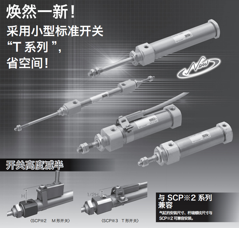 【小型氣缸開(kāi)關(guān),更為緊湊】采用小型氣缸開(kāi)關(guān)“T系列”,開(kāi)關(guān)高度為1/2。