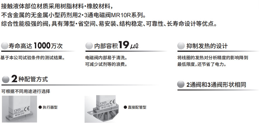CKD電磁閥 無金屬藥劑用2?3通電磁閥MR10R 2023/06/10 CKD氣動元件 CKD電磁閥 產品中心 1728 0無金屬藥劑用2?3通電磁閥 MR10RNC(通電時開)型、NO(通電時閉)型、通用型使用流體 :水、純水、藥劑配管口徑 :M5、M6、1/4-28UNF接觸液體部位材質采用樹脂材料·橡膠材料,不含金屬。符合歐洲標準的無金屬小型化學液體用2?3通電磁閥。行業:培養、分裝、生化分析設備、透析監視裝置、牙科醫療設備微信客服
