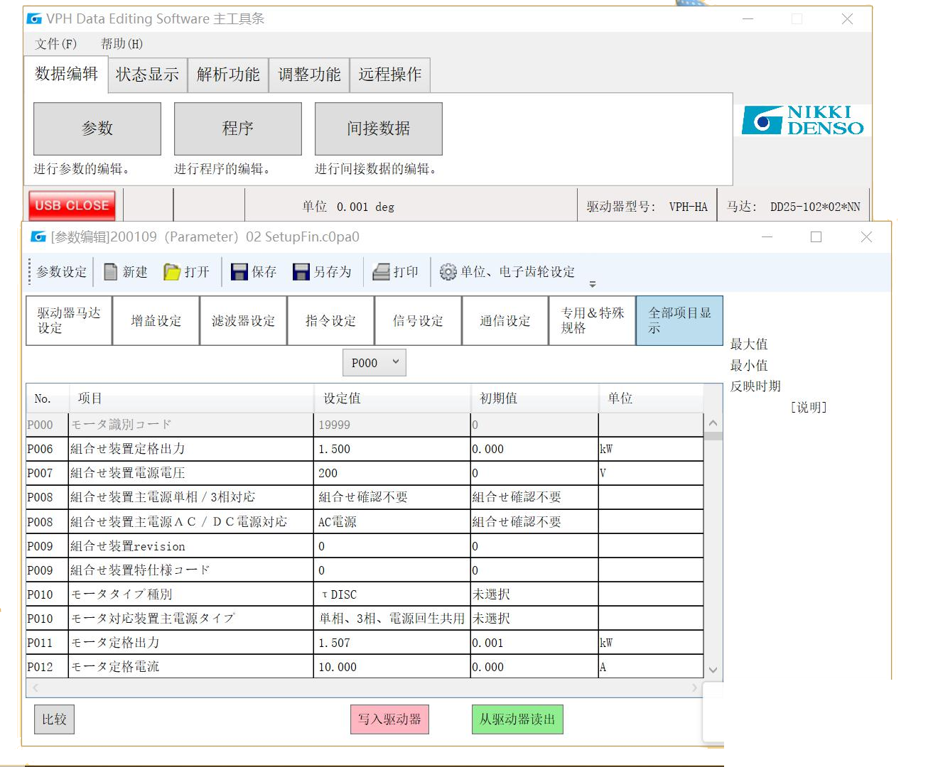 CKD日機 NIKKI DENSO DD馬達VPH驅(qū)動器調(diào)試流程 2023/10/20 分類:使用問題 常見問答 1655 0檢查馬達線路是否正常馬達運轉(zhuǎn)前是否有干涉1-1,打開軟件,點擊左下角從驅(qū)動器獲取設(shè)定,從而設(shè)定驅(qū)動器規(guī)格。 1-2,產(chǎn)品分類選擇DISC,類型選擇客戶使用的馬達規(guī)格。1-3,選擇編碼器類型(兩種規(guī)格,一種絕對式ABS,一種增量式INC。然后點擊決定。1-4,出現(xiàn)主頁面,點擊參數(shù),從驅(qū)動器讀出。1-5,該界面是參數(shù)界面。 更多詳情聯(lián)系 微信客服 上一篇: 如何選擇適合的伺服電機慣量? 下一篇: CKD電磁閥型號查詢大全—Selex閥 4KA/B、M4KA/B、MN4KB