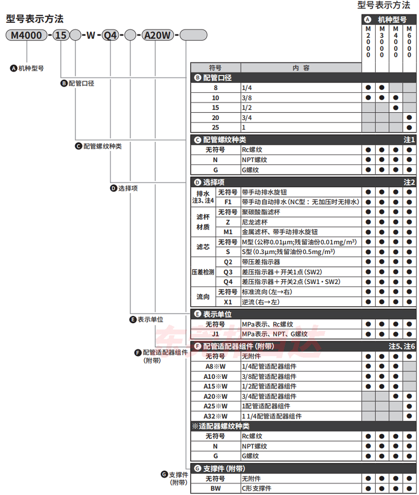 注2:帶自動排水“F1”時,最低工作壓力為0.15MPa。