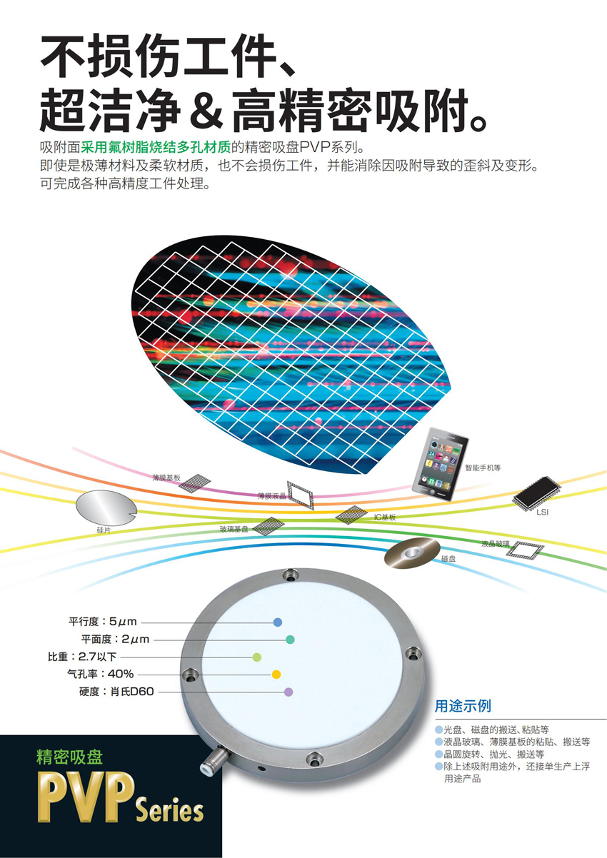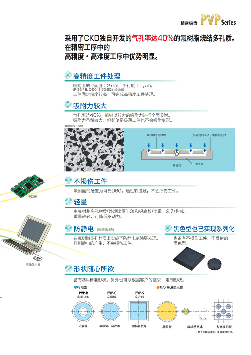 非接觸式吸盤-CKD精密吸盤 PVP Series 2023/11/24 CKD氣動元件 產品中心 真空系統元件 1403 0精密吸盤 PVP Series不損傷工件、 超潔凈&高精密吸附? 吸附面采用氟樹脂燒結多孔材質的精密吸盤PVP系列。即使是極薄材料及柔軟材質,也不會損傷工件,并能消除因吸附導致的歪斜及變形。可完成各種高精度工件處理。用途示例光盤、磁盤的搬送?粘貼等液晶玻璃、薄膜基板的粘貼、搬送等晶圓旋轉、拋光、搬送等除上述吸附用途外,還接單生產上浮用途產品微信客服